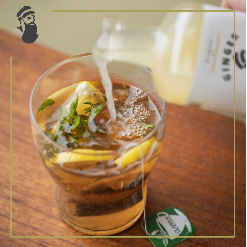 First, choose a tea you like (e.g. a bag of green tea with citrus, without ginger), then take 30–50 ml of Ginger Jack, some fresh lemon slices, and optionally a teaspoon of honey.