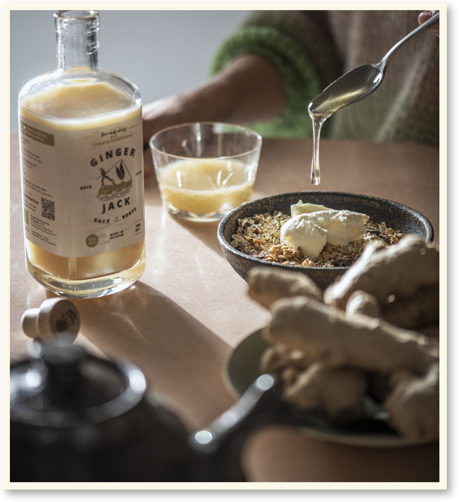 Purer Ingwersaft ist wirklich nicht lecker. Deshalb haben wir als Ingwerspezialisten und Ingwerliebhaber nach einer einzigartigen Formel gesucht, die man pur trinken kann und die wirklich lecker ist. Die Schärfe der Ingwerwurzeln haben wir gemildert, aber die Frische beibehalten, sodass man Ginger Jack und Curcuma Jane pur trinken kann. So kann man ein leckeres, frisches und kraftvolles Getränk genießen, mit allen gesundheitlichen Vorteilen von Ingwer und Kurkuma obendrauf!